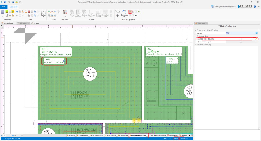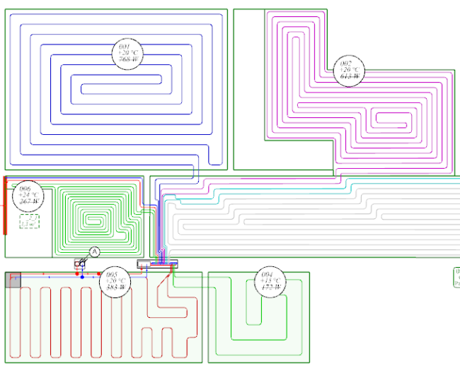 The Heating-cooling surface component (floors and ceilings) can be appended with drawings of loops. Drawings generated automatically by the program are refreshed each time the project is recalculated. It is possible to modify or append them and loops can be drawn manually. Manual editing is recommended at the final stage of design.