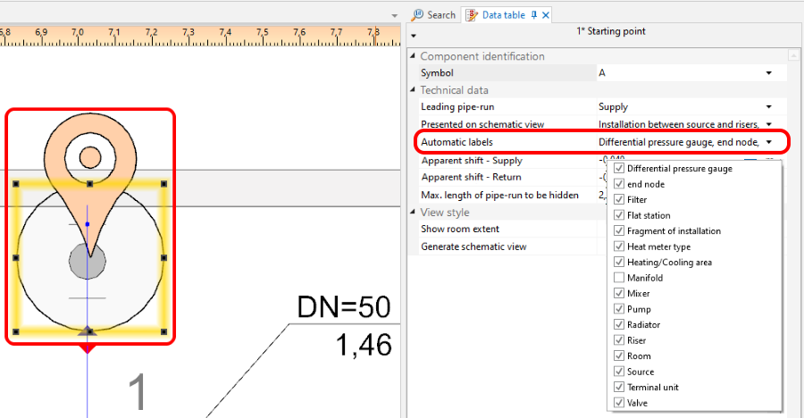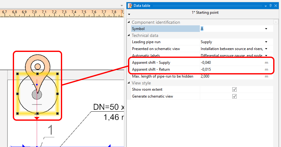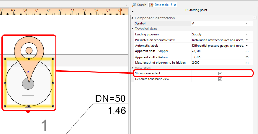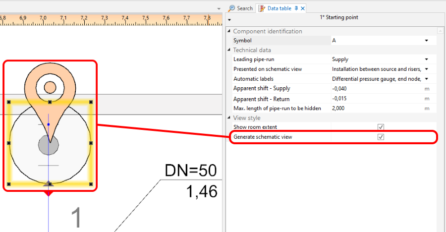 This is the starting point in the installation from which the schematic view is generated. It has to be assigned a unique symbol. Many Starting point (thermal installations) components can be inserted, and each of them generates a separate Sheet type: Schematic view ![]()