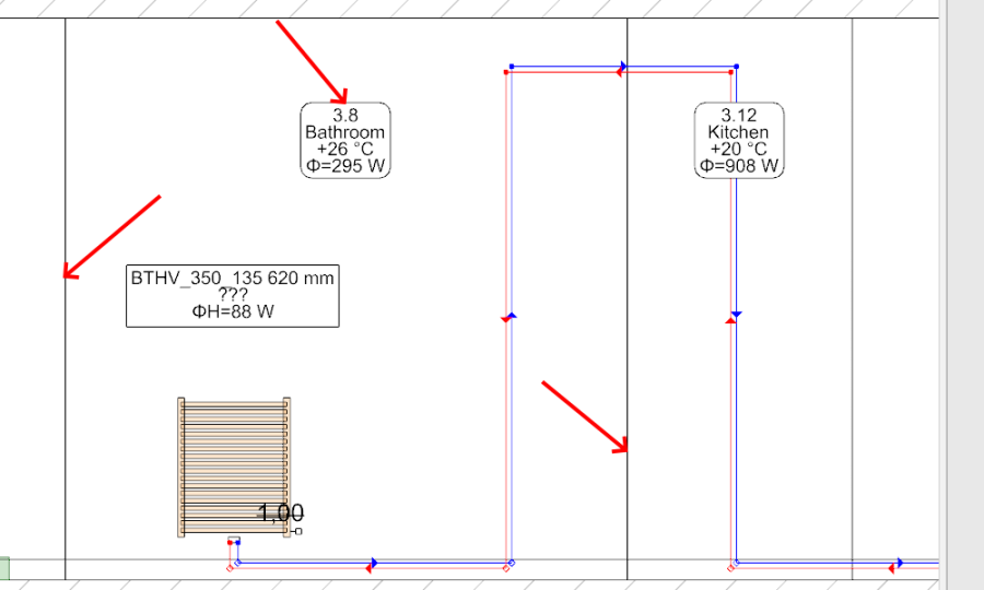 Indication of the pipe-run which has a priority when generating a schematic view. This is important when generating an asymmetrical installation (supply and return pipe-runs arranged along different routes). All junctions (tees, crosspieces) are also marked on leading pipe-runs.