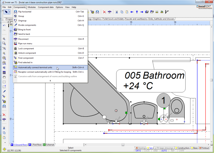 1. Mark fragment of the system to include terminal units and pipe-runs to be connected, then press Shift+Ctrl+A or select "Automatically connect terminal units" in the Components menu.