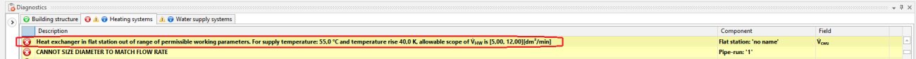 Asynchronization of medium intake for domestic hot water heating is taken into consideration while dimensioning the flat station feeding system. Flat station type and size are chosen by the user, meanwhile the program diagnoses whether a given flat station is able to deliver enough output to the heating system to which it is connected and for declared/calculated domestic hot water parametres.