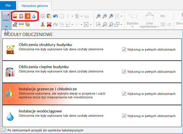 Running calculations - the Calculations section of the Main tools bar contains tools that enable starting and managing calculations. Calculations can be made for for all selected project scopes, in the depicted order (downwards), or for selected scopes. Calculation modules have been indicated with the red frame.