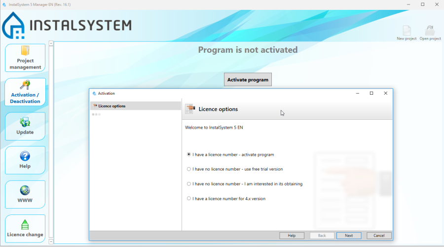The package requires installation on the user's computer and its activation. To activate standard licences, it is necessary to have a proper licence number. Trial version activation does not require any licence number. Currently available trial versions of the InstalSystem 5 package are available on our website: Trial versions.