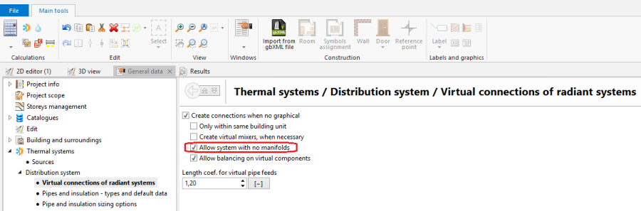 - In section Thermal systems/Distribution system/Virtual connections of radiant systems select: Allow system with no manifolds.