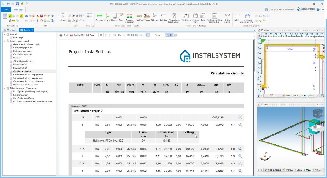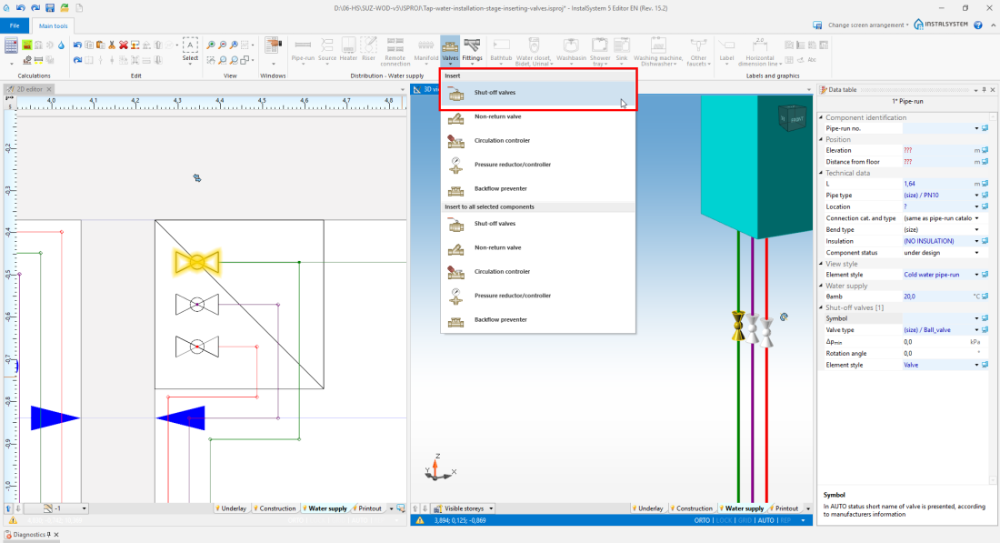 Valves may be moved in 3D view vertically on vertical sections if needed. In addition, while changing Rotation angle in Tabeli danych, it is possible to rotate valves about the pipe feed axis.