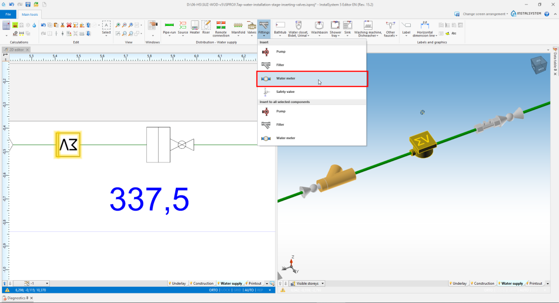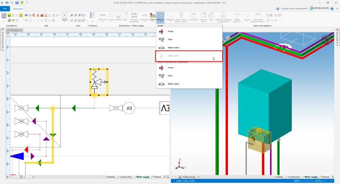 Fittings may be moved in 3D view vertically on vertical sections, if needed. In addition, while changing Rotation angle in Tabeli danych, it is possible to rotate valves about the pipe feed axis.