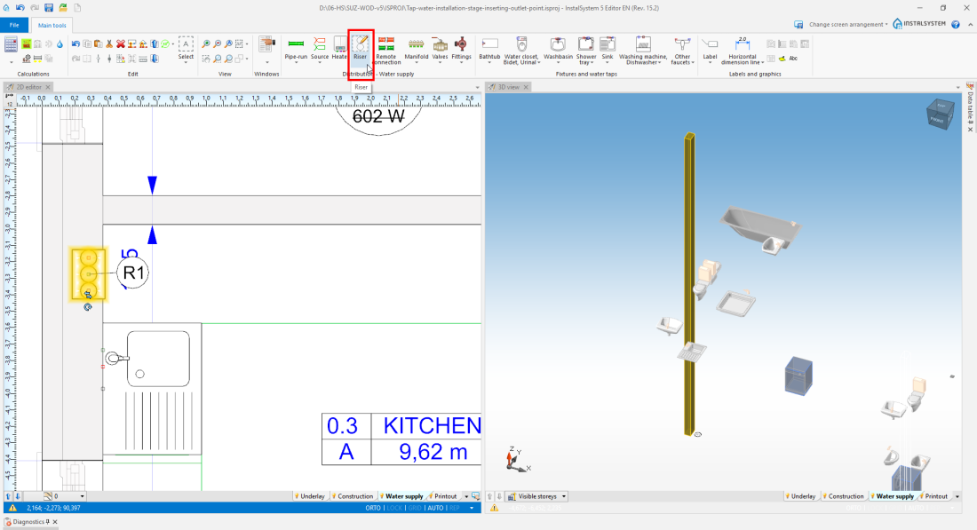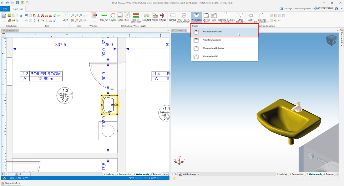 Connect water outlet points with the water distribution installation with the Automatically connect terminal units function.