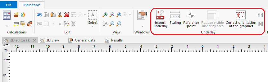 Icons of the components and functions related to importing an underlay are available in the 2D Editor window in the Main tools toolbar, section Underlay, when the Underlay editing scope is enabled. 1. Import underlay