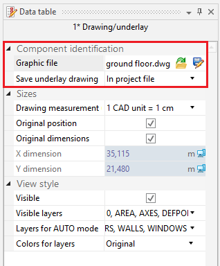 The size of the underlay can be changed in the component data table or using the Scaling tool. Additionally, in the case of a DWF/DXF file, a conversion factor between a CAD unit and a multiple or sub-multiple of a meter can be selected in the data table. This feature is especially convenient for changing dimensions of vector graphic base drawing.