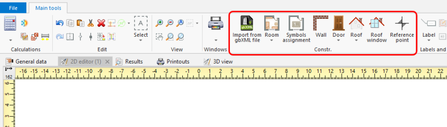 - Icons of components and functions related to the building structure are available in the 2D Editor window on the Main tools bar in the Construction section when the Construction editing scope is enabled.