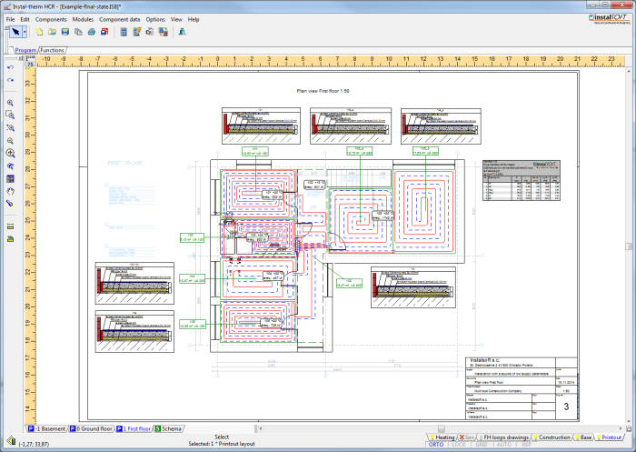Example illustrates heating installation designed for the source parameters of 60/40 Celsius degrees. Rooms for the most frequent human presence are equipped with a underfloor heating, while bathrooms, the garage and the basement are heated by radiators. The source is located in the basement, from where the medium is supplied to the receivers by two separate stacks. One of the stacks supplies radiators on all floors, the second stack supplies underfloor heating manifolds. The stack for underfloor heating manifolds is supplied with use of mixer, to ensure supply temperature at a suitable level.