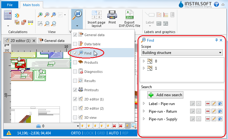 The tool enables searching for a component or a group of components within a project. As a result the found components are marked in all active windows, such as: 2D Editor, 3D view, Data table, Results, etc.