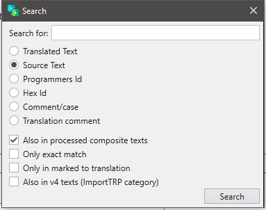An extensive text search engine is available under the "Search" button. For example, it allows you to find a text by its identifier or a translator's comment.