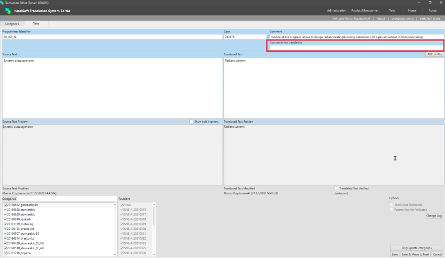 In the ‘Categories’ window you will see one or more categories, depending on the range of translations to be done. In the case of the need to translate missing/new texts this will usually be one particular category -need translation or review-.