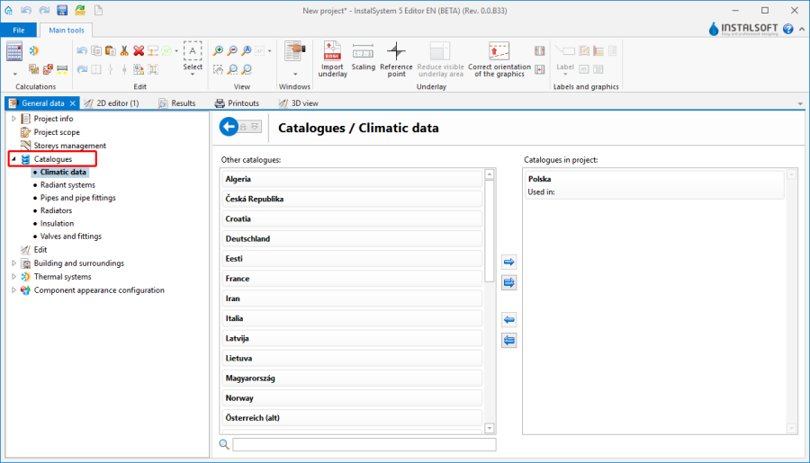 The catalogues available in the program constitute predefined, uneditable files that contain data on components that can be used when designing a system. A specific type of catalogue is climatic data. Data contained in catalogues can be entered into projects by indicating in a catalogue a product or system to be used in the project. This saves time that would otherwise be spent on entering numerous detailed data.