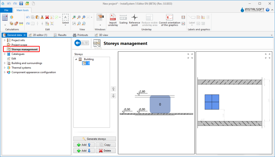 The building structure (number and basic data of storeys) can be defined or modified in this section.