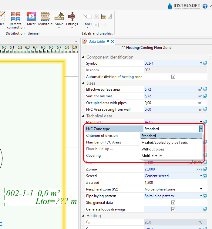 - Standard - symbolizes one or more Heating-cooling surface components, each of which is covered by a single pipe loop.