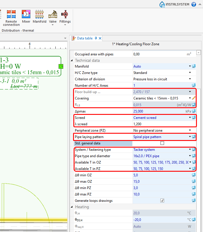 Heating/Cooling Zone symbolizes the area covered by one or more pipe loops of specified structural and operating parameters. It is used in the design of radiant heating and cooling systems (floors, walls and ceilings) and facilitates division into resultant Heating-cooling surface components.