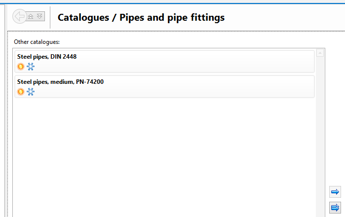 Icons under the name of the catalogue in the window indicate the scope of project calculations where the catalogue can be used: