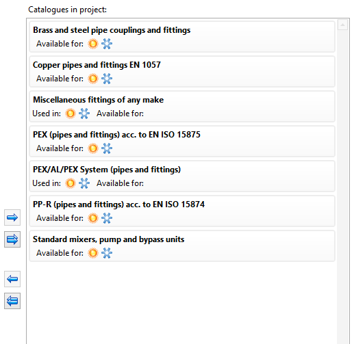The article describes the method of using catalogues in a project in terms of their general application, as well as the use of catalogue data in particular cases of project editing. The catalogues contain, in addition to technical specifications, information on interdependencies between the products that are used in advanced algorithms of selecting and sizing connections, accessories and in calculating specific functional groups. Based on that, in addition to calculation results and component parameters (e.g. initial settings of control valves) the program generates complete bills of materials. Additional graphical and technical information on products and systems contained in catalogues supplements the design process.